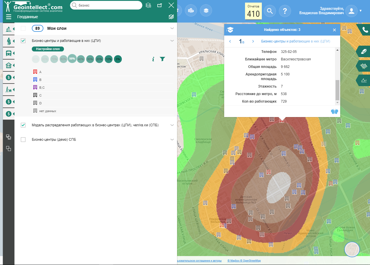 Слой “Работающие в БЦ” даёт информацию по следующим показателям: